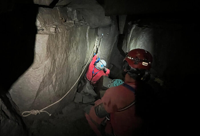 Biskupské lesy  pro nás připravili chata Salaška přímo u Kněhyňské jeskyně. Páteční večer se nese ve znamení diskusí a dobrého pití. Ráno se objevuje revírník a dováží barel s vodou a plynový vařič. A jde se na trénink do Kněhyňské propasti. Leny jde napřed a ve skrytu lesní pěšiny čeká, zda zbytek členů najde správnou odbočku k jeskyni. Nenašel a bloudili někde ve svazích. Ověnčeni vaky s lany a dalším materiálem pak dorážíme k jeskyni a zjišťujeme další zádrhel. Klíč ukrytý na obvyklém místě je pryč. Opět improvizujeme a mříž otevíráme pomocí kladívka a železné kramle. Leny s Frantou a Míšou jdou lézt, Terka s Giovannou jdou na odečty měřidel. Lezecká skupina nejprve instaluje nově lanový přístup dva poslední metry před ústím Velké propasti. Lezci si pak zkouší slanění a výstup, jištění přes půlloďák, sebejištění pomůckou Backup nebo nožní blokant. Leny zjišťuje, že starší nýty na plakety už ve skále nedrží a jeden z nich nemilosrdně vytahuje pomocí násilí. Využívá kladivo, páku, klíče i lano.