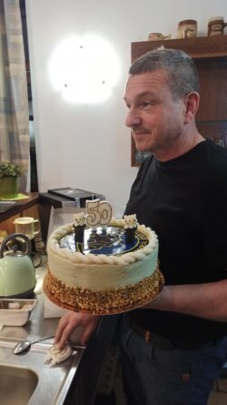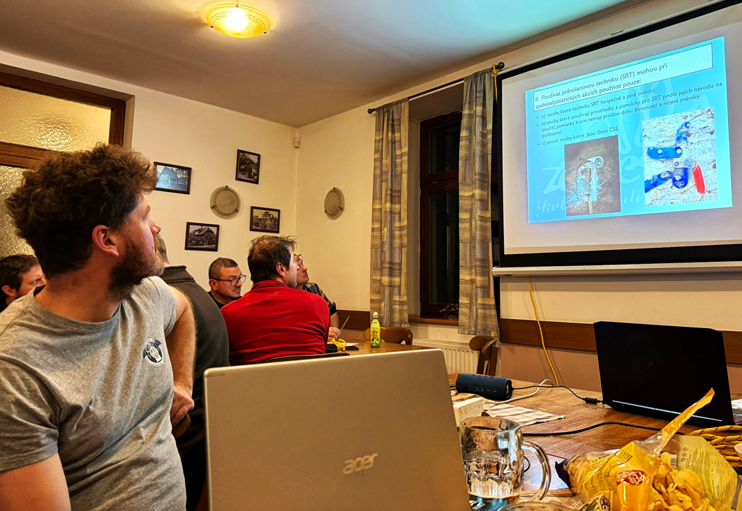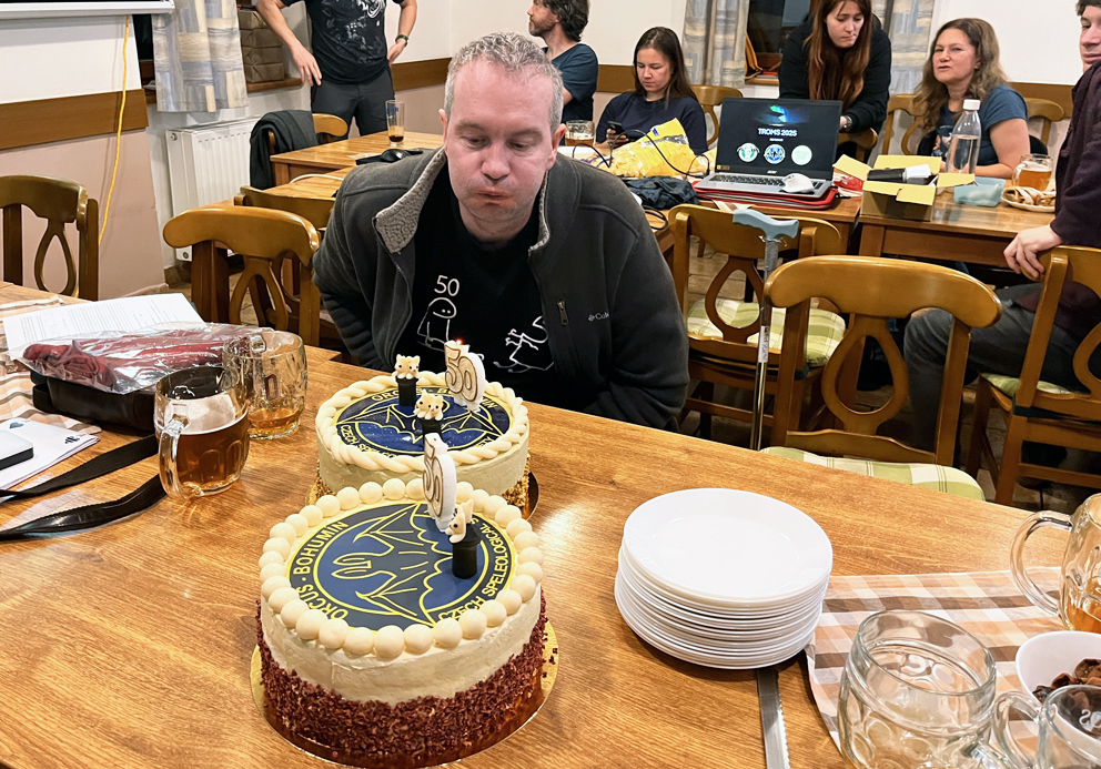 Sobotní večer pak už patřil výročce. A nejen povinný program, také přednášky o loňských expedicích, výklad a testy z bezpečnosti v jeskyních, kvíz o našich jeskyních a činnosti ORCUSu… a také díky Vojtovi kytara se zpěvy. A hlavně veliké gratulace Bobkovi, neb slavil své padesátiny a k tomu mu Láďa napekl opravdu super speciální dorty.