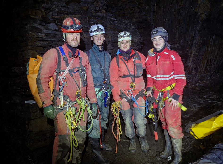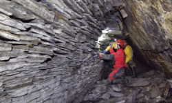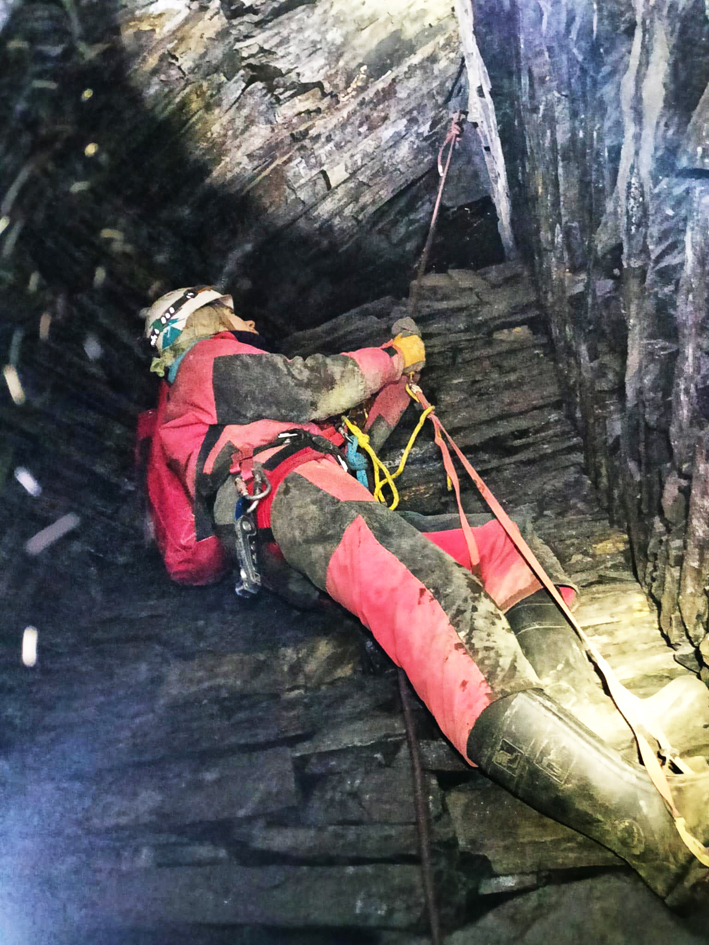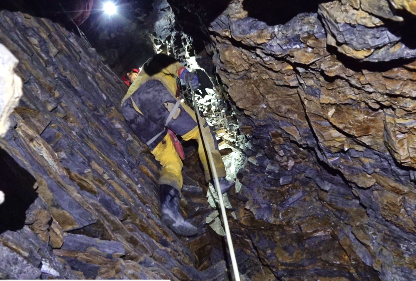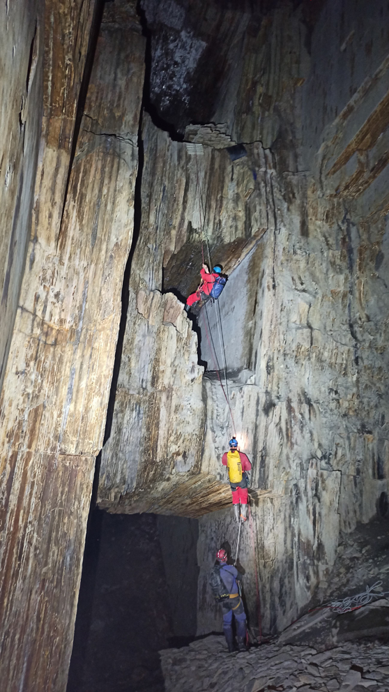 Leny si vybírá hlavně baby a jde mapovat lokalitu, kterou si včera pouze prohlíželi. S ním Jana, Míša, Krista… Vloni byly komíny na vyšší patra vystrojeny lany (díky kamarádům z krasu, kteří do komínů navrtali desítky nýtů, vylezli na patra a lana tam nechali). Ale i tak se musí vystoupit desítky metrů do horních pater, což některým dělá problém.