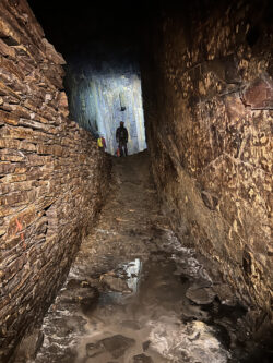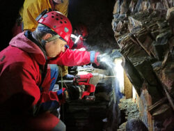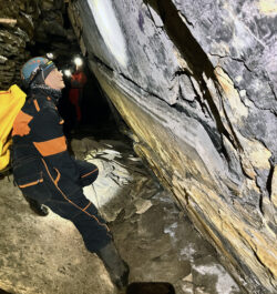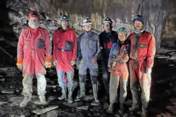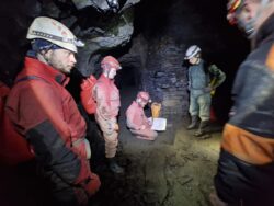 Velkou skupinu vede Roman K., do dalšího významného zimoště u obce Čermná ve Slezsku. Dolů se musí 15m hlubokou vertikálou, ale do ní Roman hází dvě lana, tak vše jde rychle. A na III patro se jdou podívat i naši hosté z Krasu. Z části zatopené chodby v břidlicové základce jsou unikátní. Jen škoda, že v kdysi nejvýznamnějším zimovišti netopýrů černých, je jich dnes jen pár kusů. Pro kluky možná štěstí, neboť v minulosti kontrolovat základku, kde byli barbastelly schované, znamenalo 8 hodin v podzemí. To by dnes ani nestihli večeři.