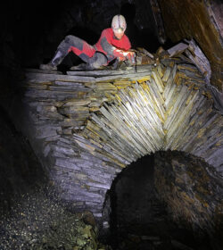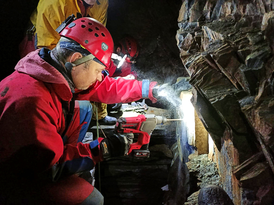 Větší skupina mířila do významnějšího a mnohem většího zimovišťě netopýrů nad řekou Moravice. To je hodně rozsáhlé, tak měli všichni co dělat. Pepa, Pavel (toho vidíme po roce) Kuba, Jaryn, Roman a Roman st., Vojta a Vašek. Netopýři jsou tady i ve výše položených komorách, kde se musí vylézt komíny v základce. Toho se ujali lezci Kuba a Jaryn. Po kontrole spodních pater se dělíme a na horní patra vyráží Kuba, Jaryn, Pavel, Roman a Vojta. A nejen na kontrolu. Dolů s horních pater se musí sestupovat nepříjemným lomeným komínem, vysokým tak 15 m. Abychom učinili sestup bezpečným, rozhodujeme se nad komínem naistalovat kotvící bod s lanem.