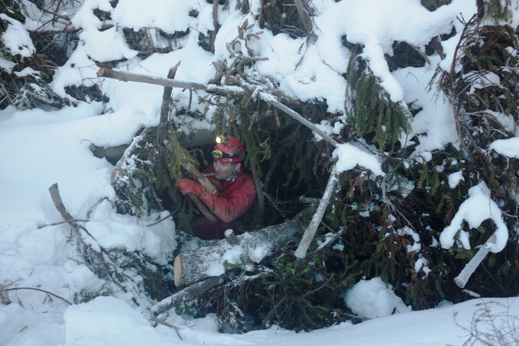 Další důl je  námi nazývaný, Vrápencový důl. Hlavní problém je ale najít v zasněžené mýtině vstup do dolu . Les je totiž  nově vykácený a samozřejmě ti co jej káceli, nechali všude haldy větví a zbytků stromů. Nakonec pod jednou haldou větví zasypaný vstup nacházíme. Tudy asi netopýři do podzemí nemohli létat.