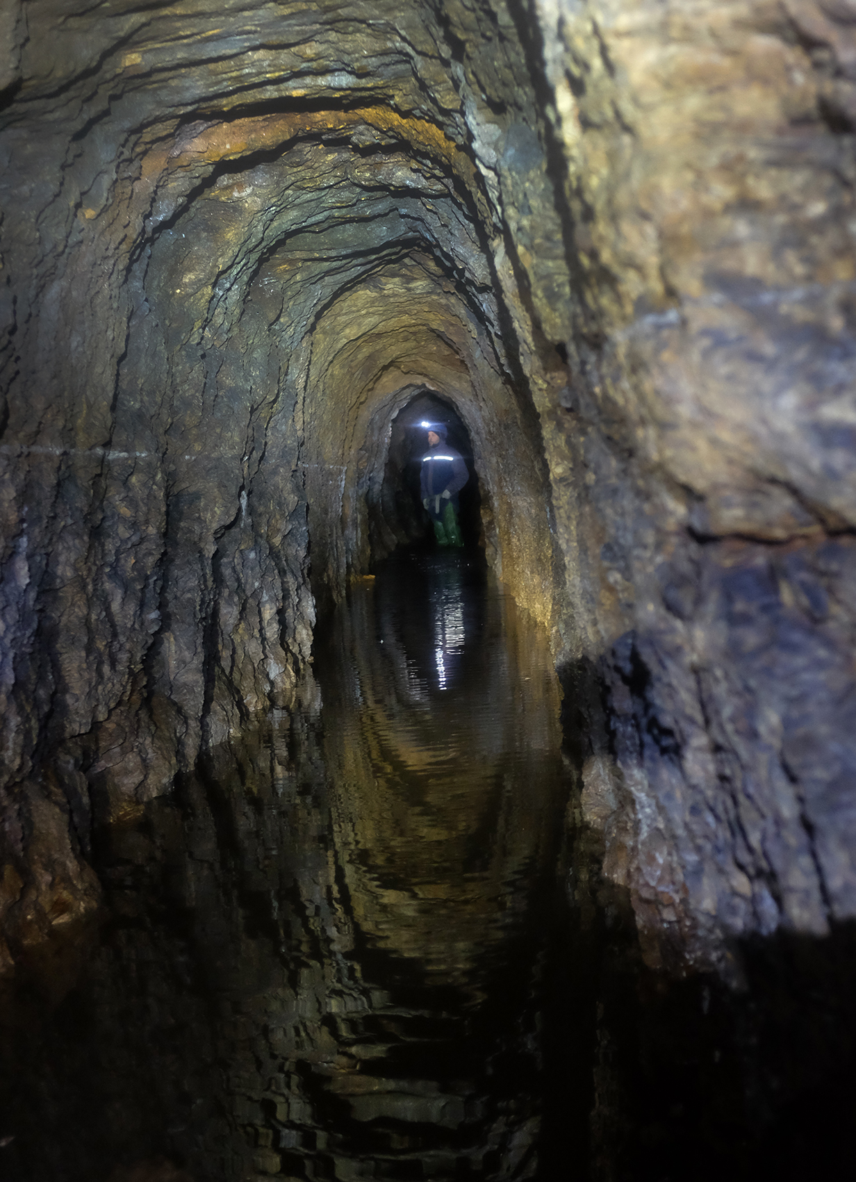 Týden na to pokračujeme v kontrolách netopýrů ve štolách v okolí Zlatých hor. Nejdříve do Porfyroidové štoly. Dnes je tam tolik vody, že Honza musí do atomkecek. Jenže byly děravé, tak hned měl vodu v gumáku. Výsledek byl slabý, jeden netopýr.