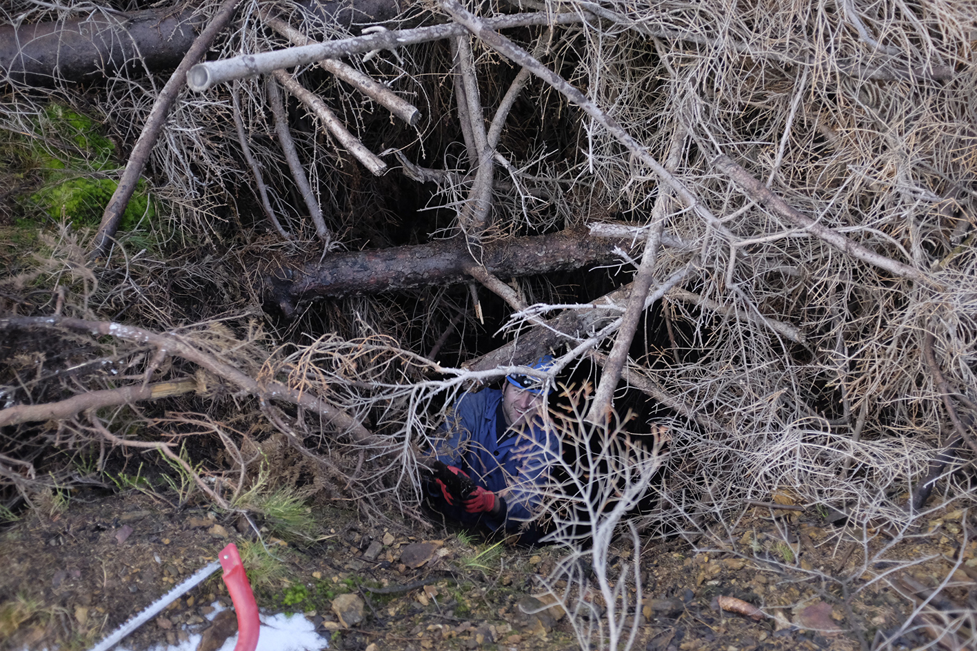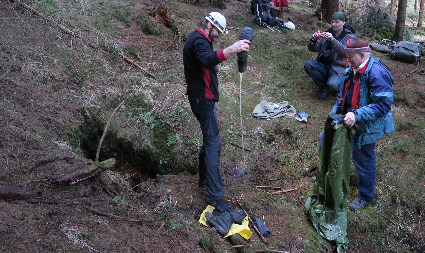 Od kostela Marie Pomocné do terénu vyrazily tři skupiny. Nejvýše ke štolám na hřeben museli vystoupit Petr, Jirka a Dalibor. Měli za cíl štoly, kde jsme kontroly neprováděli více jak deset let. Štolu“Nulté patro“ a další, které nemají ani jméno. Nebyl sníh, tak výstup nebyl problém. Problém je ale voda v těchto štolách. Jak brzy zjistili, hloubka je taková, že nestačí ani atom kecky. A „broďáky“ měl Petr jen jedny. A zachoval se sparťansky. „Broďáky „ půjčil Jirkovi a sám vyrazil do zatopených štol na boso. Ještě že venku nebyl mráz.
