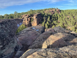 Po prohlídce suchých částí jeskyně míříme dále směr Albarracín. Cesta se vine mezi vysokými skalními stěnami, nad horskými jezery, hlubokými kaňony a náhorními plošinami. Tady na rozdíl od autostrády si člověk užije pravé Španělsko. Již navečer zastavujeme vysoko nad Albarracínem ve skalistém pohoří Pinares de Rodeno. Vysoké, bizardní i kouzelné skalní věže jsou tvořeny především pískovcem. Konkrétně jde o červený pískovec (španělsky rodeno), který pochází z období triasu. Tento pískovec má charakteristickou červenohnědou barvu díky obsahu železitých oxidů (hematit), které zbarvují horninu. Nejvyšší vrchol Cruz de Montoyo dosahuje výšky 1602 m n. m. Erozí na skalních stěnách vznikly nejrůznější  skalní tvary jako tafoni (různé žlábkové, jamkové dutiny ve skalních stěnách), voštiny,  Liesegangovy obrazce. Jsou to barevné kruhové obrazce vznikající na povrchu skal zřejmě reakcemi při zvětrávání oxidů železa. A ty nás zajímají především. Už proto, že v našich beskydských skalních formacích tyto obrazce nemáme. Snad proto, že neobsahují tak velké množství oxidu železa. Proto mají spíše šedé zbarvení. Stáří skal Pinares de Rodeno je přibližně 250 miliónů let. Skály nejsou pouze geologickým fenoménem ale převisy a skalní abri jsou zde plné skalních maleb neolitických lovců a malby jsou volné a nezabezpečené k prohlídce.