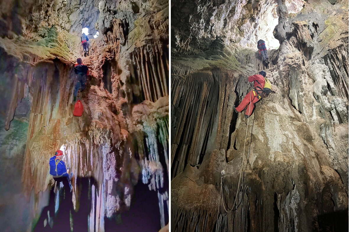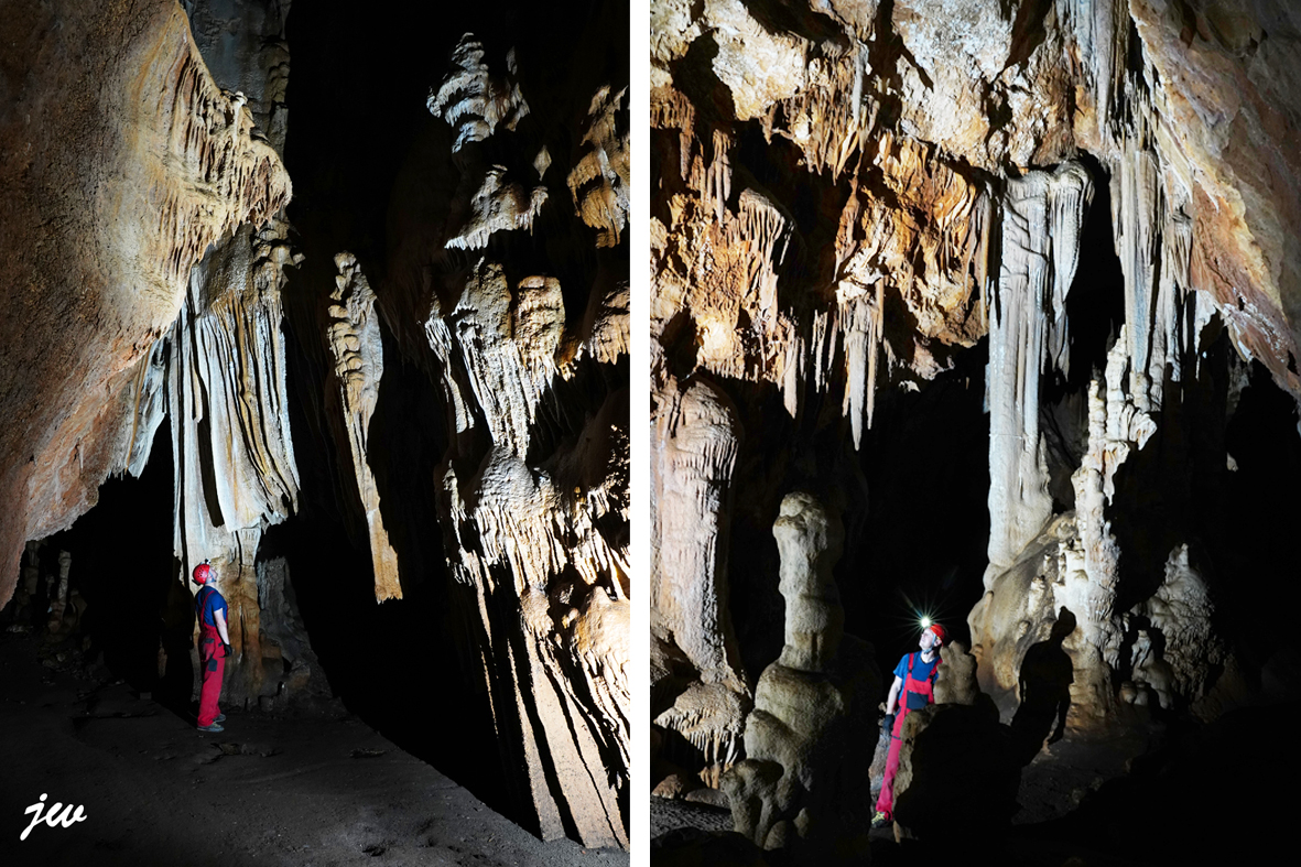 Příští den přijíždíme na místo srazu se speleology klubu Resaltés z Murcie. Jak jinak než v baru. Čekají nás staří známí Chosé a Vicente. Ti nás dnes povedou do jeskyní na svazích Sera de Segaria nad městem Beniarbeig. Balíme vše potřebné na propasťovitou jeskyni a za letní teploty vystupujeme prudkým svahem ke vstupu do jeskyně. Vstup tvoří asi 15 metrů hluboká propast, kterou Vicente vystrojuje lany. A jak je u Španělů, na cestě musí být hodně přepínek. Tady stačily čtyři. Sestupujeme do velkého sálu, který pokračuje dvěma směry a je přeplněný bohatými, velkými krápníkovými formami. Jednotlivá části jeskyně mají i své názvy. Galerie Madona, Lotrinský labyrint. Nás ale zaujala Velká síň excentrů. Se stropu visí velké sintrové záclony dlouhé až 5 metrů a mezi krasové procesy vytvořily tisíce excentrů (formy rostoucí horizontálně) a za ní Síň vlajek, což jsou 5 metrů vysoké a téměř 2 metry široké sintrové „vlajky“. Dno jeskyně je pokryto guánem, neboť jeskyně slouží jako úkryt stovek netopýrů, kteří při naší návštěvě kroužili nad námi. Využívají ale hlavně mnohem výše položených stropů jeskyně.