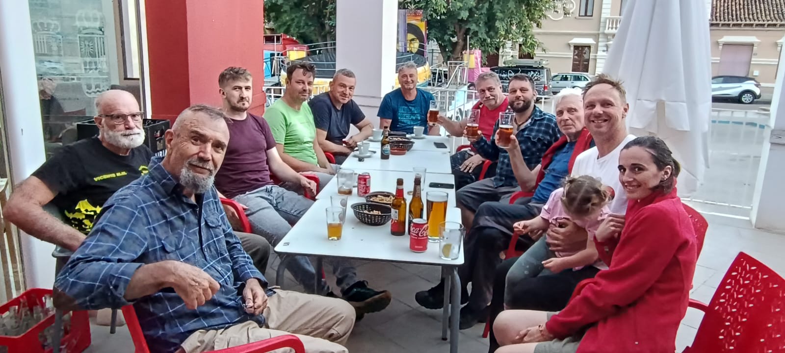 Večer se v místě noclehu setkáváme s druhou části výpravy, která přicestovala z Česka mikrobusem. A přivezli dárky pro španělské kamarády a hlavně kartony piva. A všichni jsme ubytování v penzionu El Cid Coutry Club. Je skvělý-  zvláště večeře, které tam pro nás organizuje ukrajinský personál.