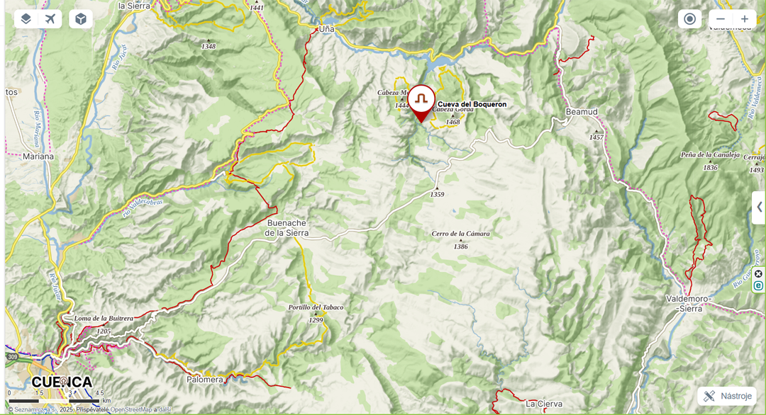 První cíl je otevřená propast Torka Rubia. Zajímavé turistické místo. Otevřená vertikála, hluboká okolo 80 metrů není ničím ohraničena, ale sestoupit na dno bez lana není možné. A na to nemáme čas. Je to jedna z mnohých propastí tady v okolí. Náš cíl je pár desítek kilometrů dál, jeskynní systém Cueva del Boquerón, Jedna to z nejkrásnějších jeskyní v pohoří Serranía de Cuenca. Jedná se o vodní jeskyni, kterou lze normálně překonat pouze v čase delšího sucha. Jindy je velmi rychle zaplavována vodou, která vytváří v jeskyni několik sifonů, které lze překonat pouze s potápěčskou výstrojí. My ale přijíždíme na konci období sucha, tak že jeskyně je přístupná.