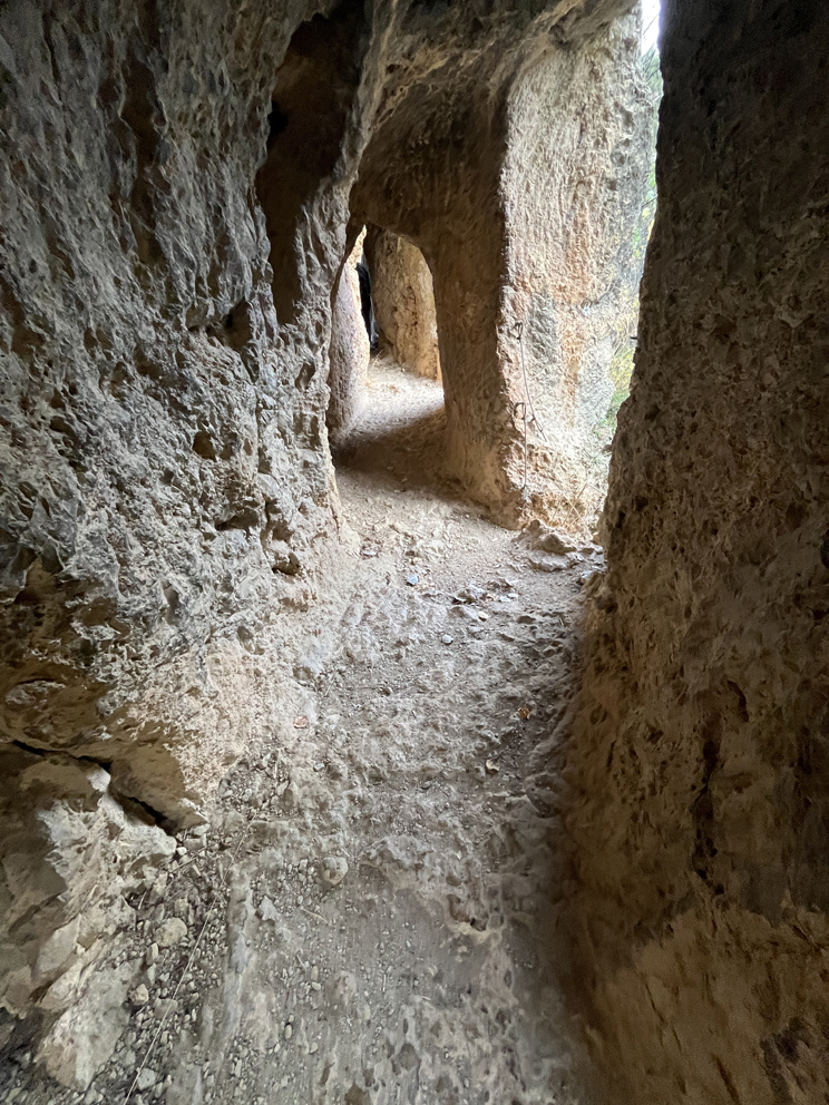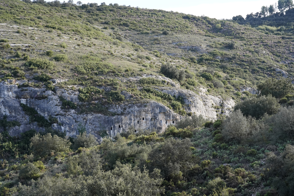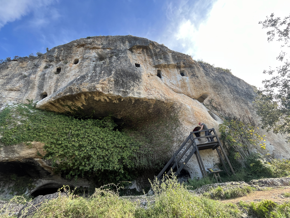Umělé jeskyně se nacházejí kolem přírodního úkrytu, převislé skály, která obsahovala pozůstatky z doby bronzové, kolem roku 1 500 př. n. l. Jeskyně byly vyhloubeny během islámské okupace této části Španělska, s největší pravděpodobností jako sýpky, jednoduché sklady obilí a dalšího zboží. Jejich původ nebyl definitivně objasněn. Cesta zpět k zaparkovaným automobilům vedla po původně postavené trati okolo kaple Ermita de la Mare de Déu de la Llum I de Sant Anto. Scházíme zpět do údolí k zaparkovaným autům a už z dálky vidíme, že jedno z aut má dveře dokořán. Je záhadou, jak k tomu došlo, ale z auta se vůbec nic neztratilo.