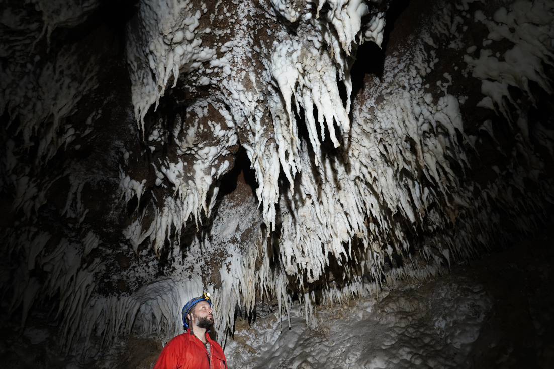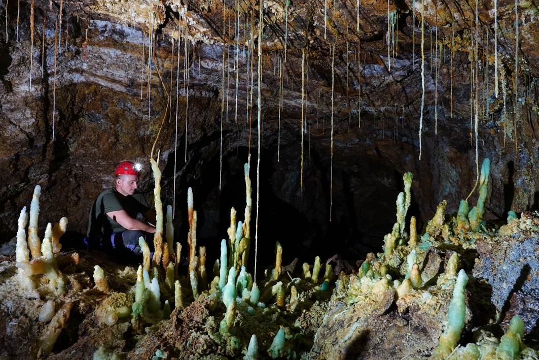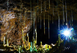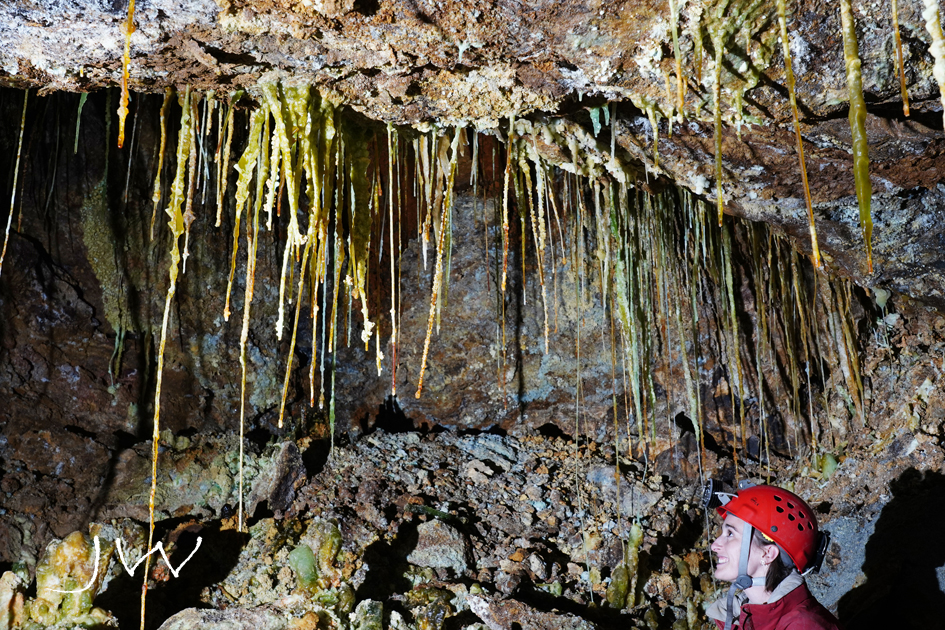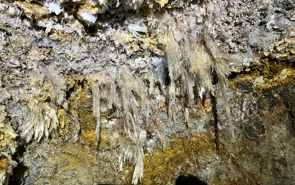 Nízkou štolou opět pronikáme do systému obřích štol a odtěžených komor, nazývaný Cruz Chiquita. Na stěnách komor se třpytí plochy plné krystalků pyritu, modré, červené úseky chodeb a na stěnách všude přítomné vlasové formy epsonitu, nazývané také „jeskynní vata“. Je znám také jako epsomská sůl nebo heptahydrát síranu hořečnatého. Epsomská sůl se běžně prodává jako hlavní složka koupelové soli s přísadami a zpříjemňuje koupel. V chodbách a komorách tohoto dolu dlouhé, třpytivé a jemné vlasovité formace pokrývají opravdu veliké plochy a jejich délka často přesahuje i 15 cm. Jenda aby nám ukázal, že epsonit je zcela zdraví nezávadný, klidně si na něm pochutnává.
